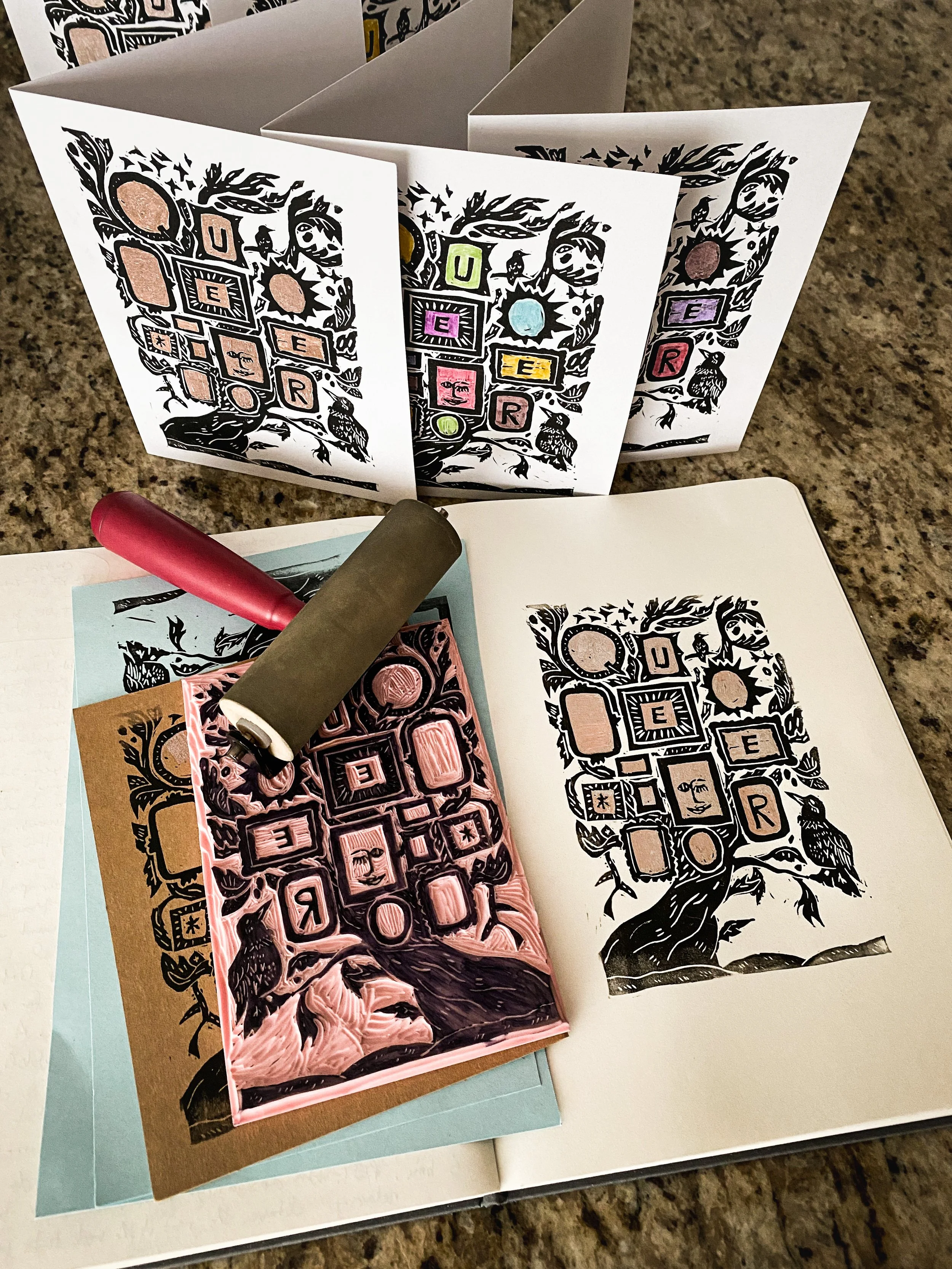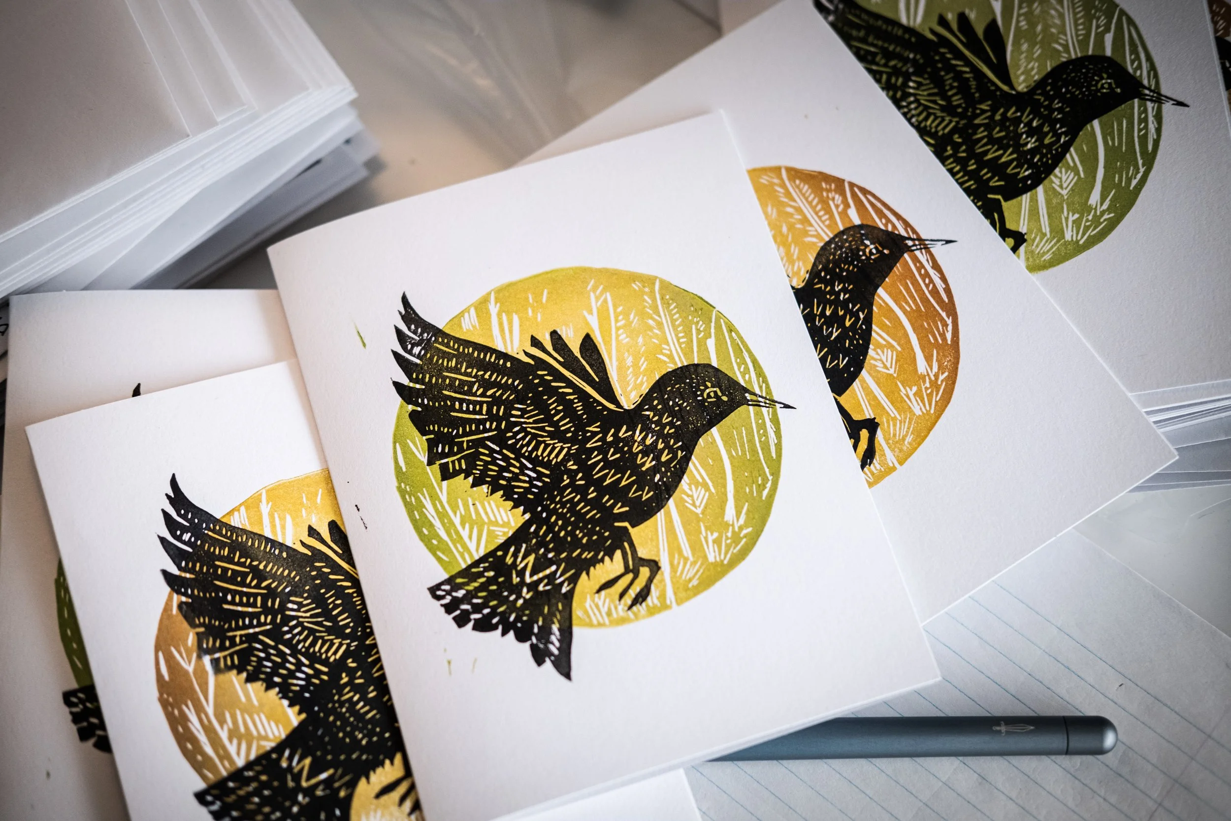Starlings are considered an invasive pest, and yet I love them. They are scrappy, they have beautiful iridescent feathers, and they will steal a french fry from your hands at a park or along the waterfront if you are not careful. Besides being a charming creature, they inspire me and make me reflect on the ways I can contribute to change. It is a privilege to create and send out these cards every year.