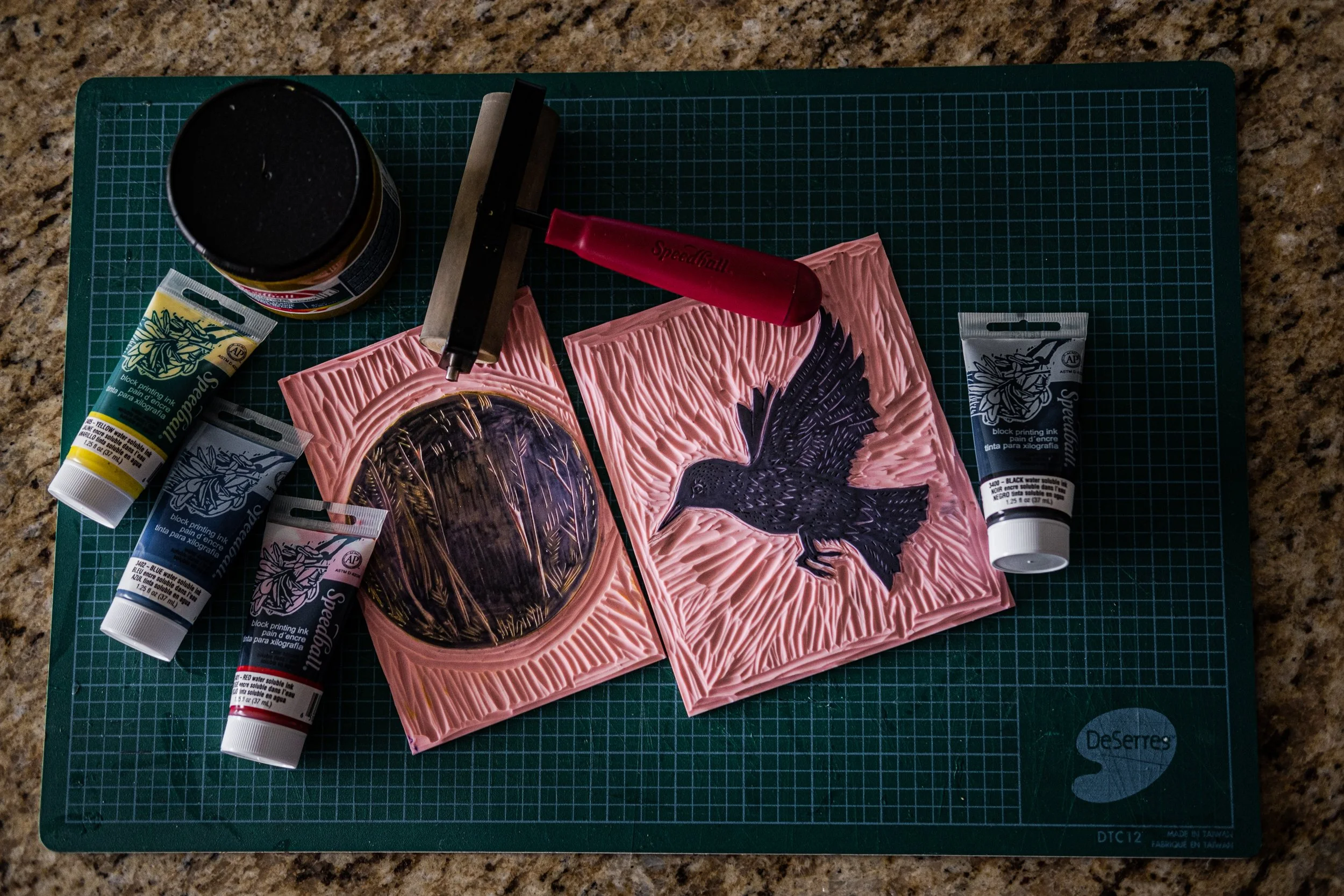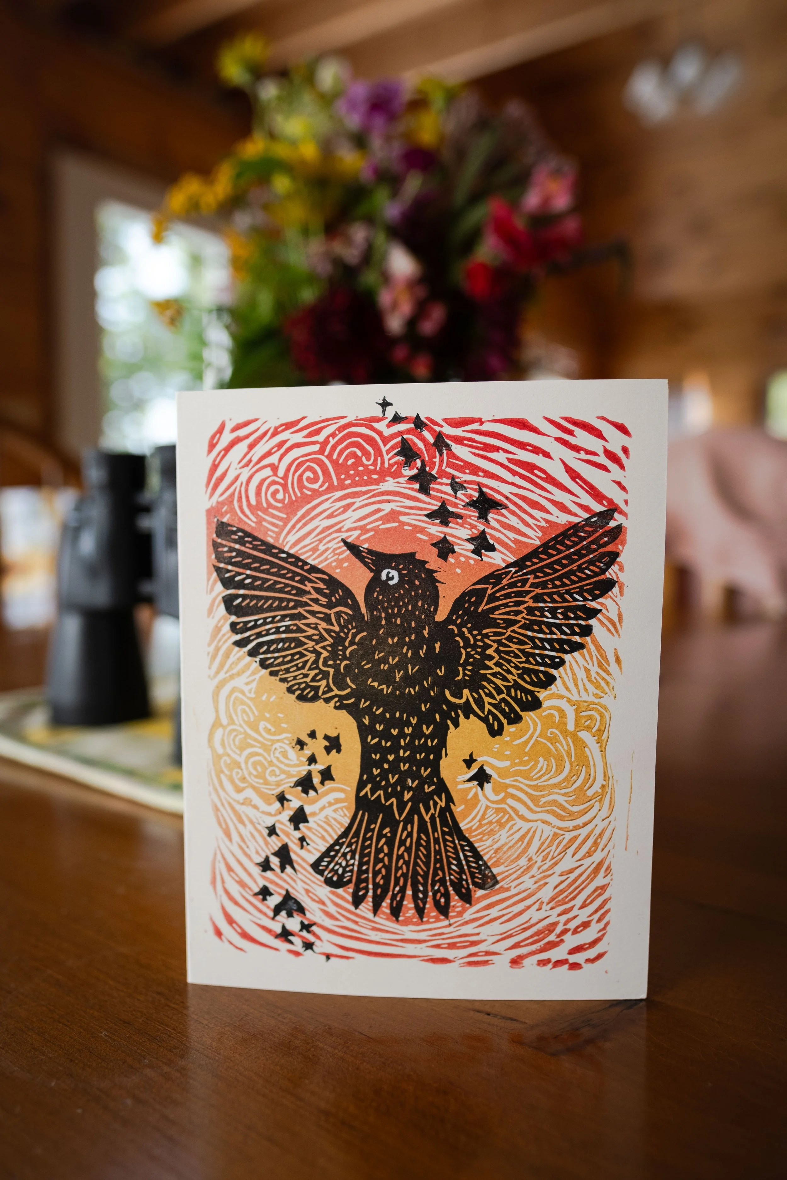Starting in 2018 I began sending out linocut prints to 100 people and places who have helped me believe a better world is possible. It could be a cafe where I felt at home, coworkers who helped me navigate challenging times, or people who are making a difference. In 2019 I started sending out linocut starlings, inspired by own experience with the European Starling and the writing of adrienne maree brown in Emergent Strategy. The work of adrienne maree brown as been foundational in my understanding of facilitating change in complex systems. I like to believe I and the others who receive these cards are forming a complex murmuration of our own. We are each of us influencing each other towards the creation of a more just and harmonious world. Sometimes in ways we don't even know.