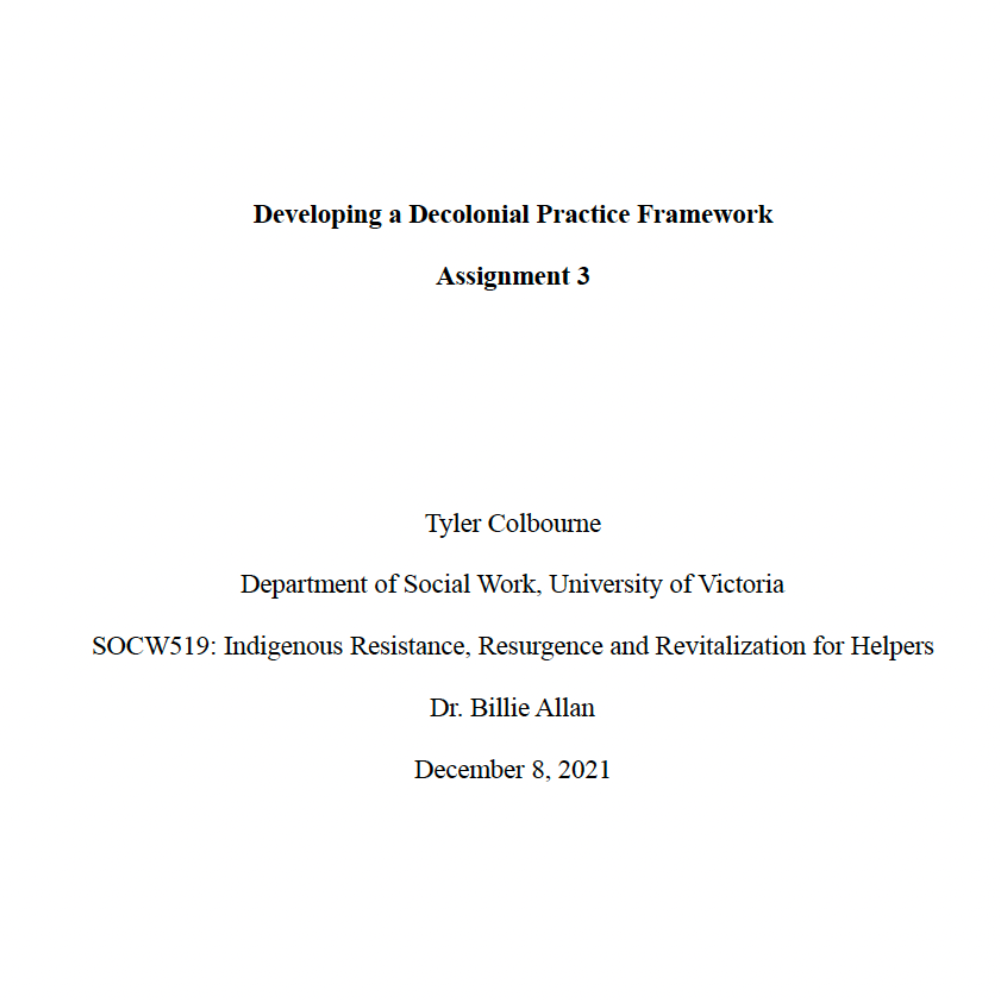 December 8, 2021, by Tyler Colbourne: Developing a Decolonial Practice Framework, Department of Social Work, University of Victoria. SOCw519: Indigenous Resistance, Resurgence and Revitalization for Helpers. This paper outlines my personal decolonial practice framework developed through my learning and reflection in this course.