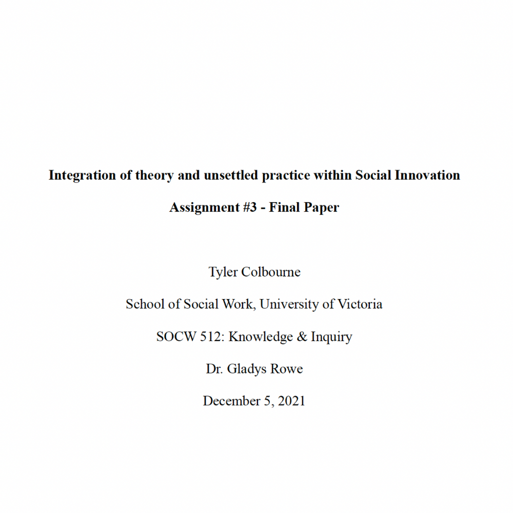 December 5, 2021 by Tyler Colbourne: Integration of theory and unsettled practice within Social Innovation: Assignment #3 - Final Paper. This paper outlines my reflections and critical decolonial analysis of my practice context in the area of social innovation.