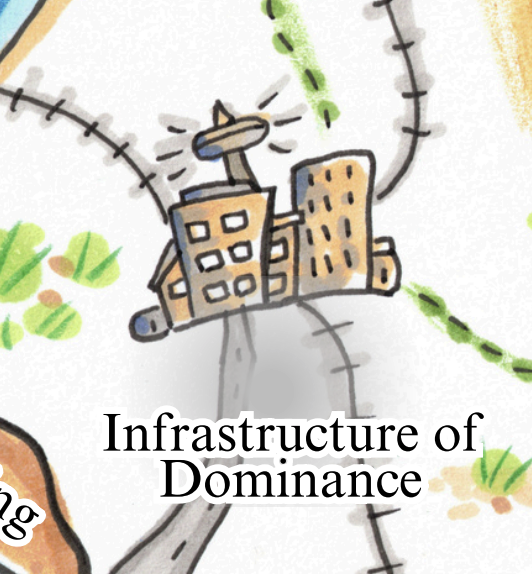 I grew up in a military family where many people did not complete their high school education and the military was considered your best shot for a life. I almost joined the military twice, but found myself yearning for something different. I am also a product of many influences of settler colonialism, white supremacy, capitalism, and neoliberalism. I see these forces reflected in the Infrastructure of Dominance. The built structures inside me and around me that uphold dominant ways of knowing and being are reflected on the map here in the roads, tracks, and buildings. I see the dominance of my white settler identity as being reflected in the Infrastructure of Dominance. I am complicit in settler colonialism, but it is also something that I resist and seek to dismantle. But it is there, all around me, sometimes existing as its own gathering places, or as pathways and journeys between destinations in my learning journey. The Infrastructure of Dominance is not just a place on the map, but roadways and journeys across the map that intersect and interact with other areas. It reflects both barriers and opportunities for learning. I can walk and travel on this infrastructure, but I have to recognize that these structures do not belong to the land, but have been built on top of it. Much like the dominant forces and ways of knowing and being that construct the world around me, the Infrastructure of Dominance is ever present.