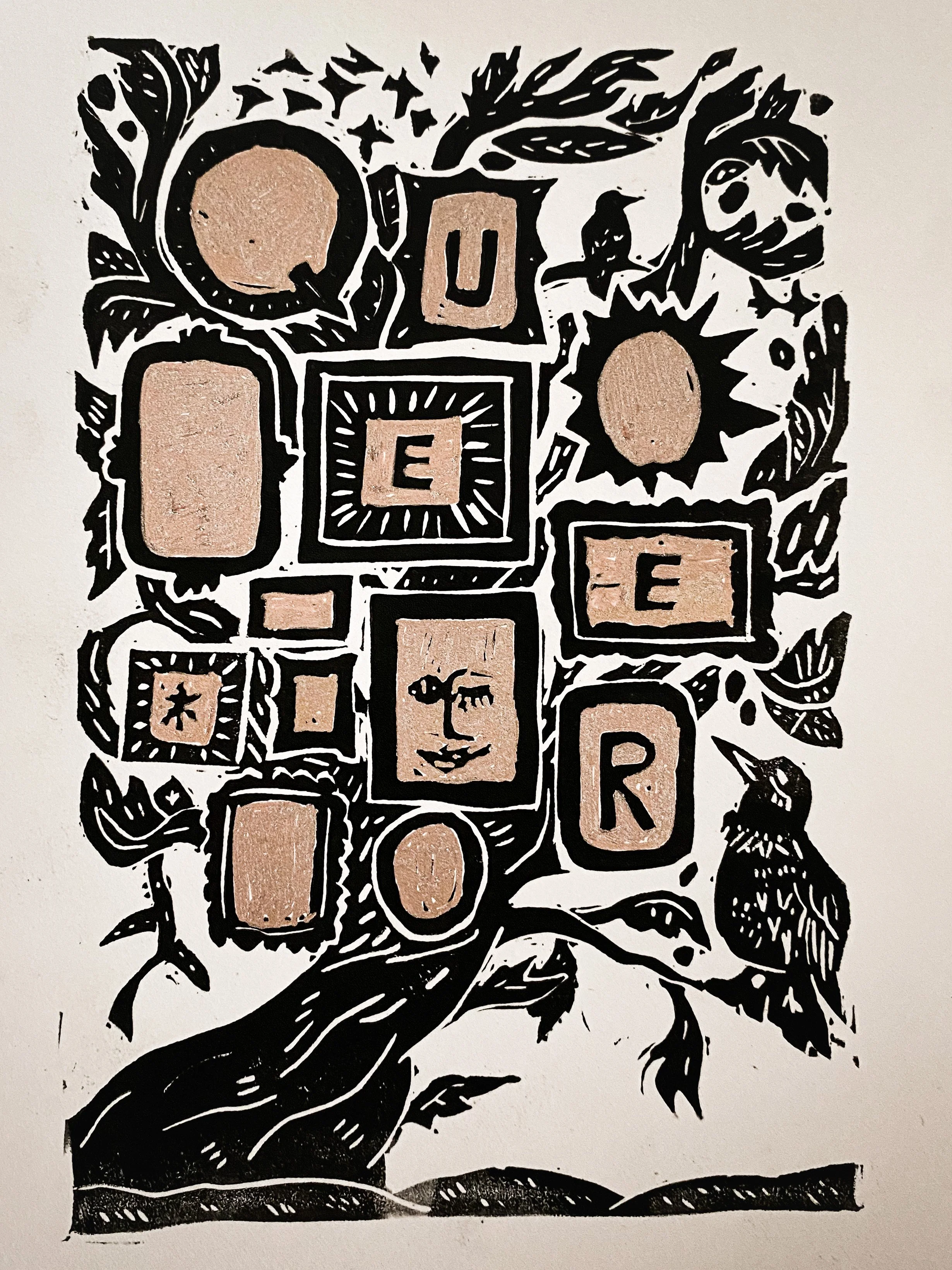 2023, by Pride/Swell+: Lino Printing Prompt: Carving out Multigenerational Queer Spaces. I include this artefact to highlight my engagement in critical queer knowledge building and art making. This is a project I am incredibly proud to be a part of and it was an honour to make this linocut that represents queerness, emergence, complexity, and multi-generational queer spaces.