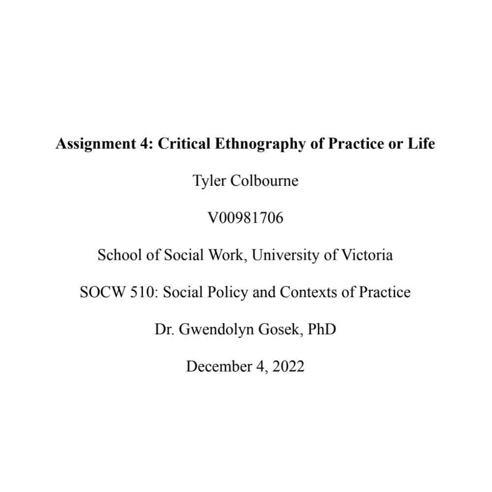 December 4, 2022, by Tyler Colbourne: Assignment 4: Critical Ethnography of Practice or Life. This paper outlines my reflections and critical and decolonial analysis of policies related to my practice context at the time.