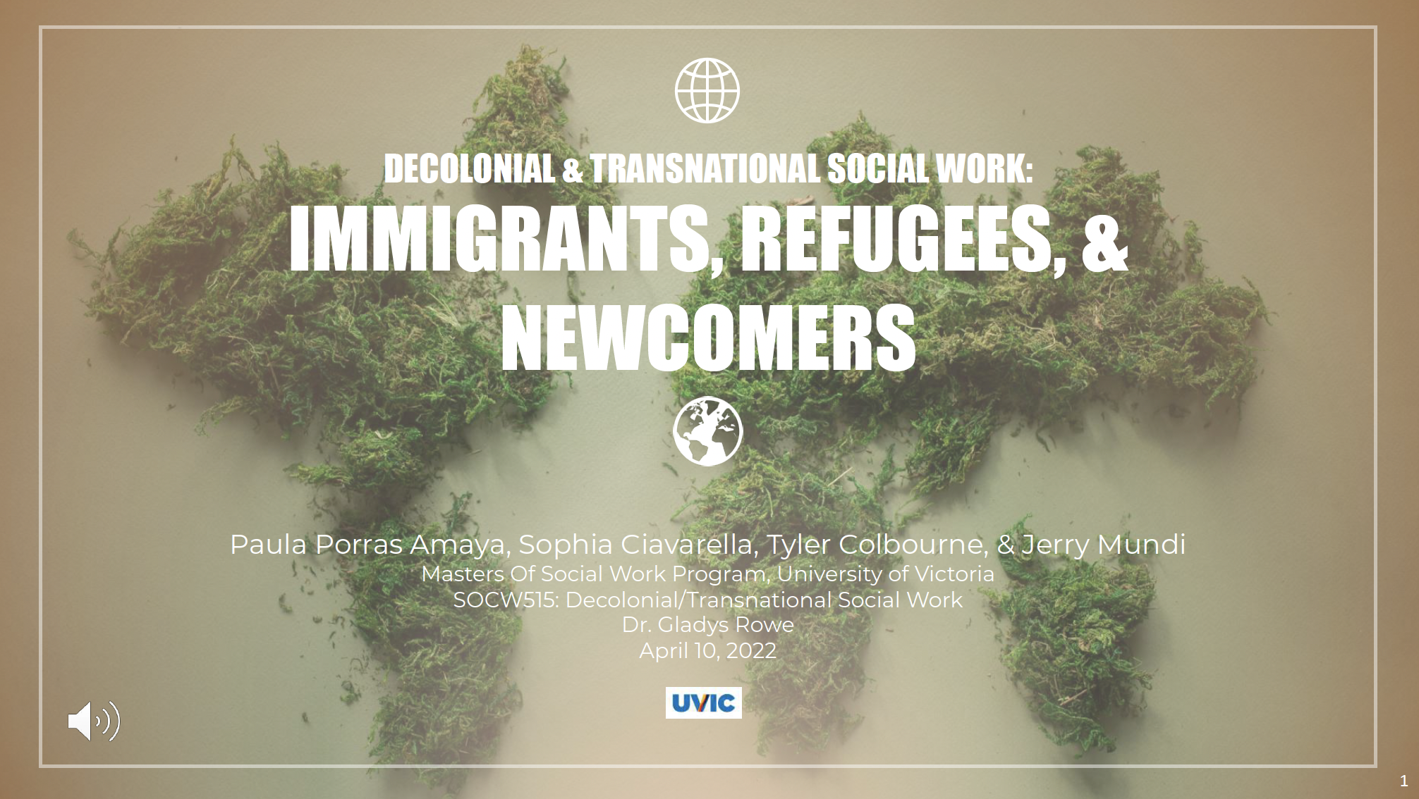 April 11, 2022, by Paula Porras Amaya, Sophia Ciavarella, Tyler Colbourne, and Jerry Mundi: Decolonial & Transnational Social Work: Immigrants, Refugees, & Newcomers. This presentation outlines knowledge and learning related to interconnectedness and decolonial social work practice that is beyond colonial beliefs about borders. This presentation was designed by myself and demonstrates my creativity and design skills as they relate to social work learning and practice.