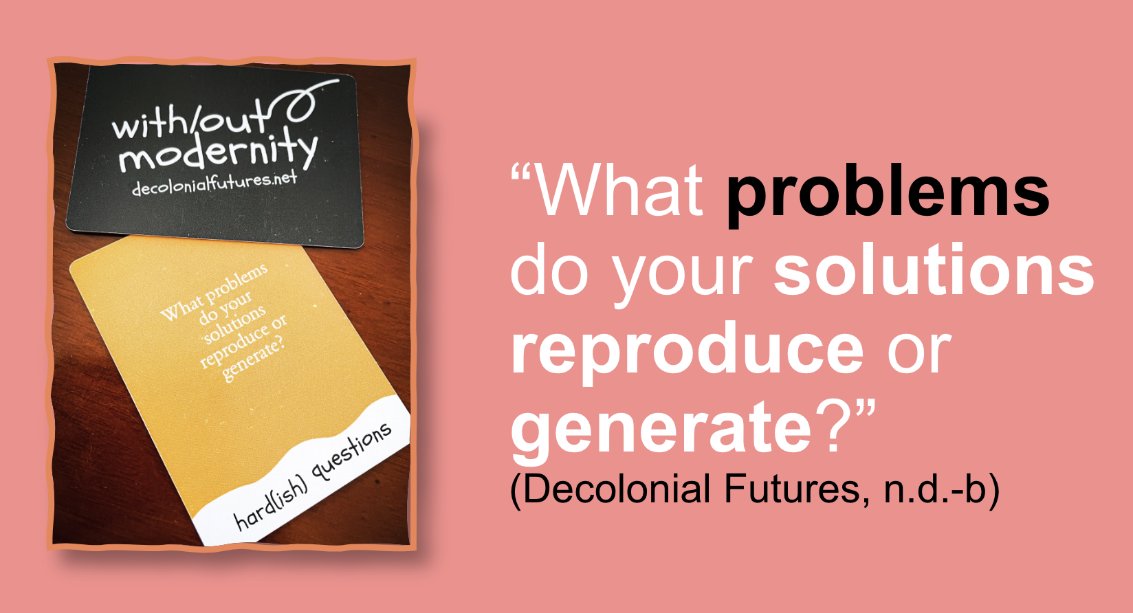 I feel accountable as a white settler Canadian social worker to address and reconcile the harms of my ancestors and my present-day complicity in oppressive ways of knowing and being. Ultimately, there is a paradox in striving for decolonial practice within colonial systems. This paradox is represented in the artefact below from the With/Out Modernity Cards by Decolonial Futures. The card asks, "What problems do your solutions reproduce or generate?" (Decolonial Futures, n.d.-b). This question and card represent calls for Humility, for seeing the Interconnectedness, and for grounding my practice in Resistance/ Transcendence. I will hold these lessons as I strive to recognize the potential harms and challenges I can recreate or produce in my practice.